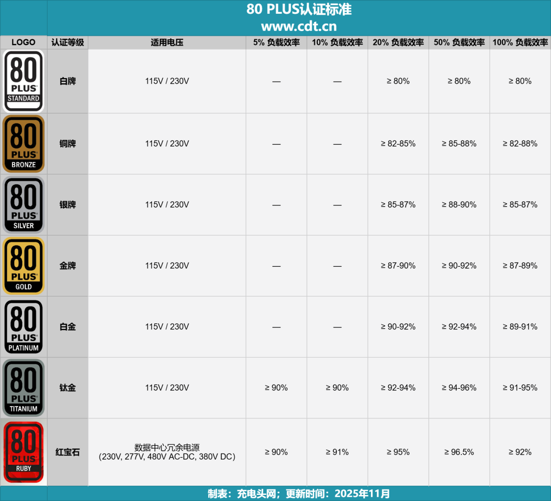 Ruby红宝石认证是80PLUS 体系中面向数据中心的新高等级标准,于2025年提出,主要针对230V、277V、480V交流以及380V直流输入的机架式冗余电源。在5%~100%全负载范围内,它对效率和功率因数设定了明显高于传统白金、钛金的门槛,例如在20%与50%负载点要求接近95%~96.5%的转换效率,并在20%以上负载阶段要求更高的功率因数。通过Ruby认证的电源,能够在高密度机房场景中进一步压缩能耗损失,为数据中心整体能效优化提供更大的空间。